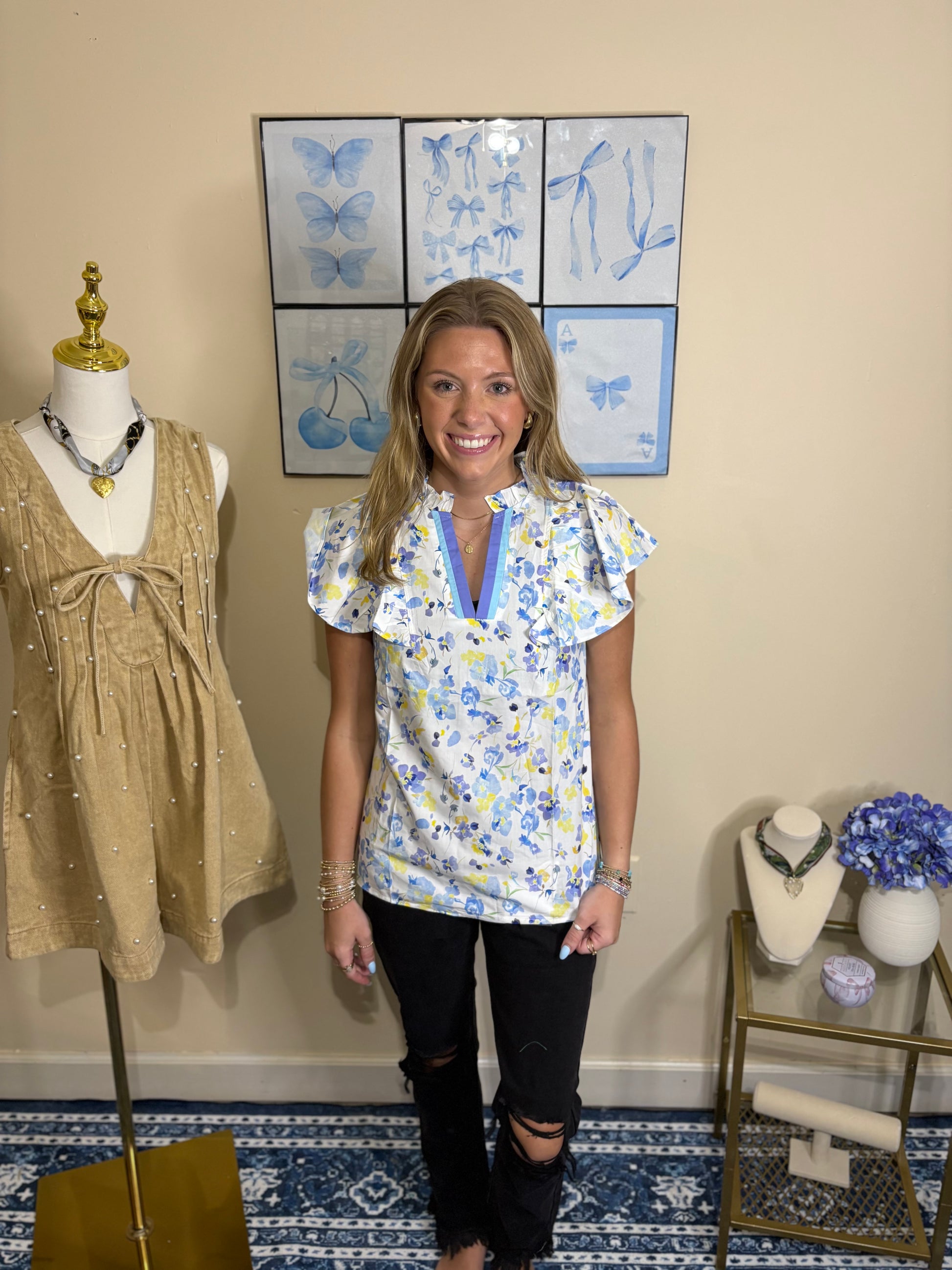 Floral print with blue/purple outlines around the V-neck.