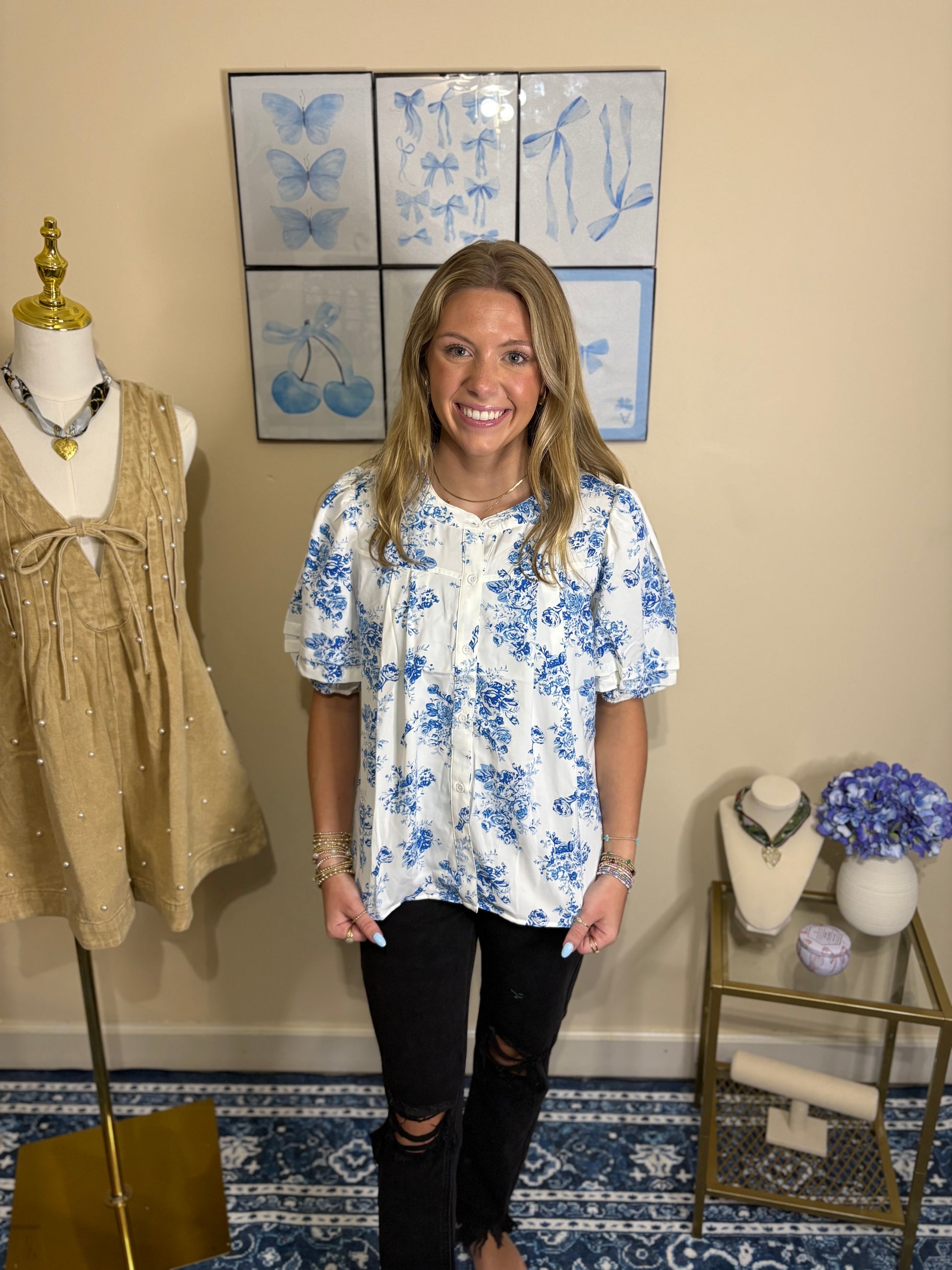 Floral pleated puff sleeve button up